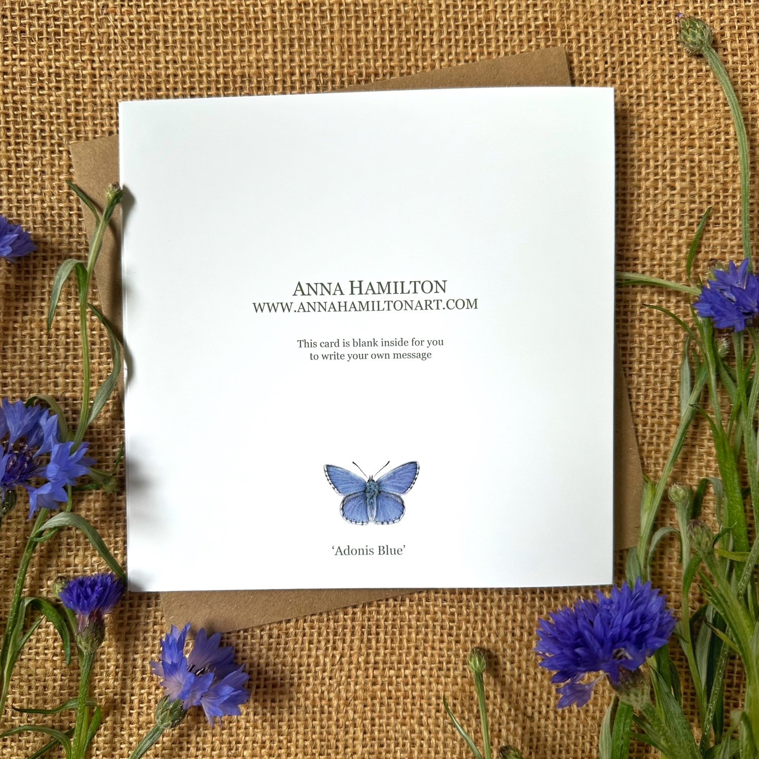 15x15cm greetings card featuring Adonis Blue butterfly design.